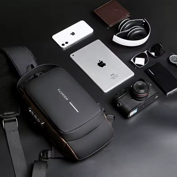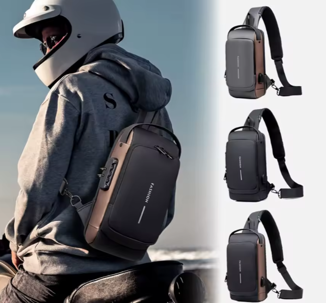 A sleek anti-theft crossbody bag crafted for modern men, combining security and style. Designed with a password lock, integrated USB charging port, and made from waterproof, wear-resistant leather and cloth. Ultra-lightweight and ergonomically built for spine comfort, with a spacious main compartment and timeless solid color options.